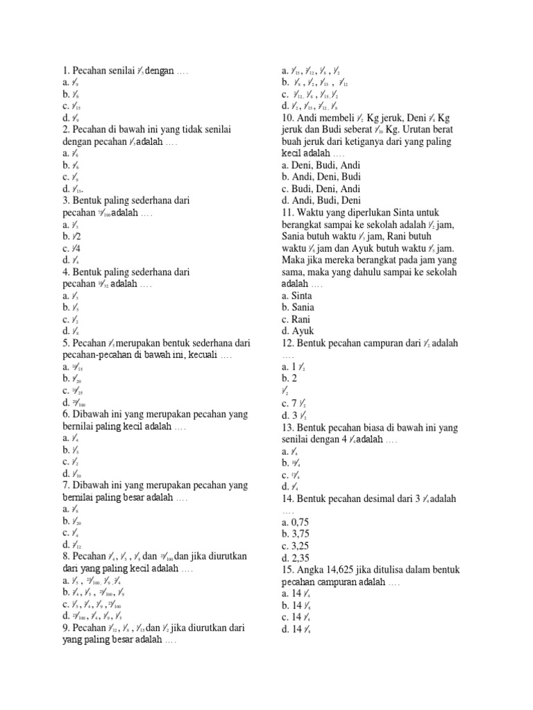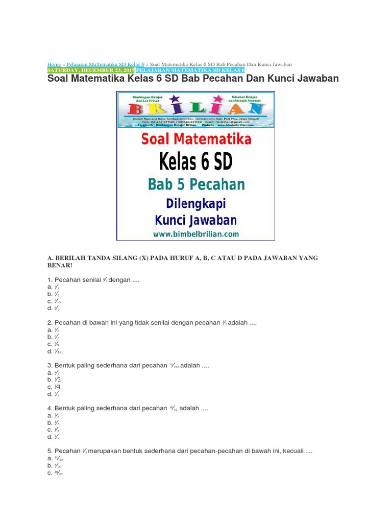 Download Soal Matematika Kelas 6 Sd Bab Pecahan Dan Kunci Jawaban Library Pendidikan