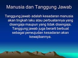 Setiap manusia yang telah dilahirkan didunia ini pasti memiliki tanggung jawab kepada tuhan. Sehingga bertanggung jawab menurut kamus bahasa indonesia adalah berkewajiban menanggung memikul jawabmananggung segala sesuatunya atau memberikan jawab dan menanggung akibatnya. 2011 pengertian kebebasan yang bertanggung jawab adalah kebebasan yang tidak mencelakakan atau menimbulkan kerugian bagi orang lain yang dilakukan dengan sikap menghargai dan menghormati hak hak orang lain.