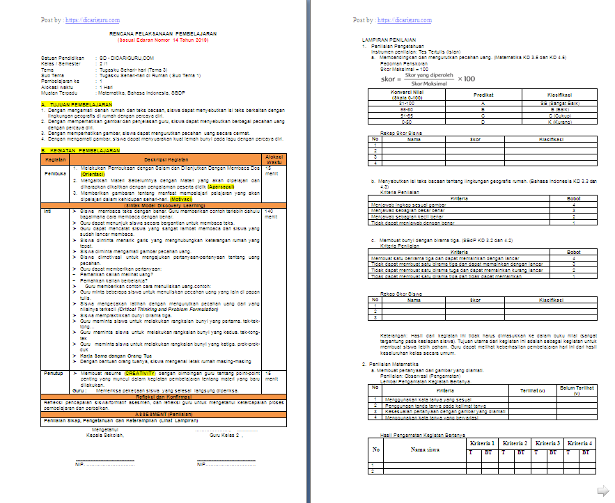 Rpp 1 Lembar Kelas 2 Sd Mi Tema 3 Tugasku Sehari Hari Antapedia Com