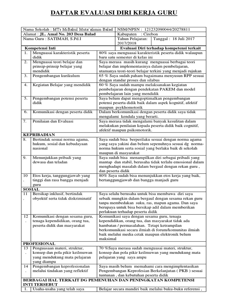 Contoh Pengisian Evaluasi Diri Guru Untuk Pengembangan Keprofesian Berkelanjutan