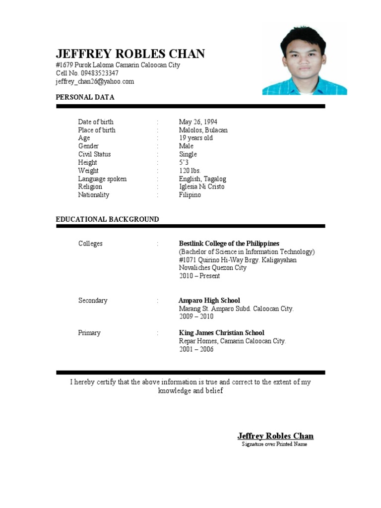 Curriculum Vitae Tagalog Language Philippines