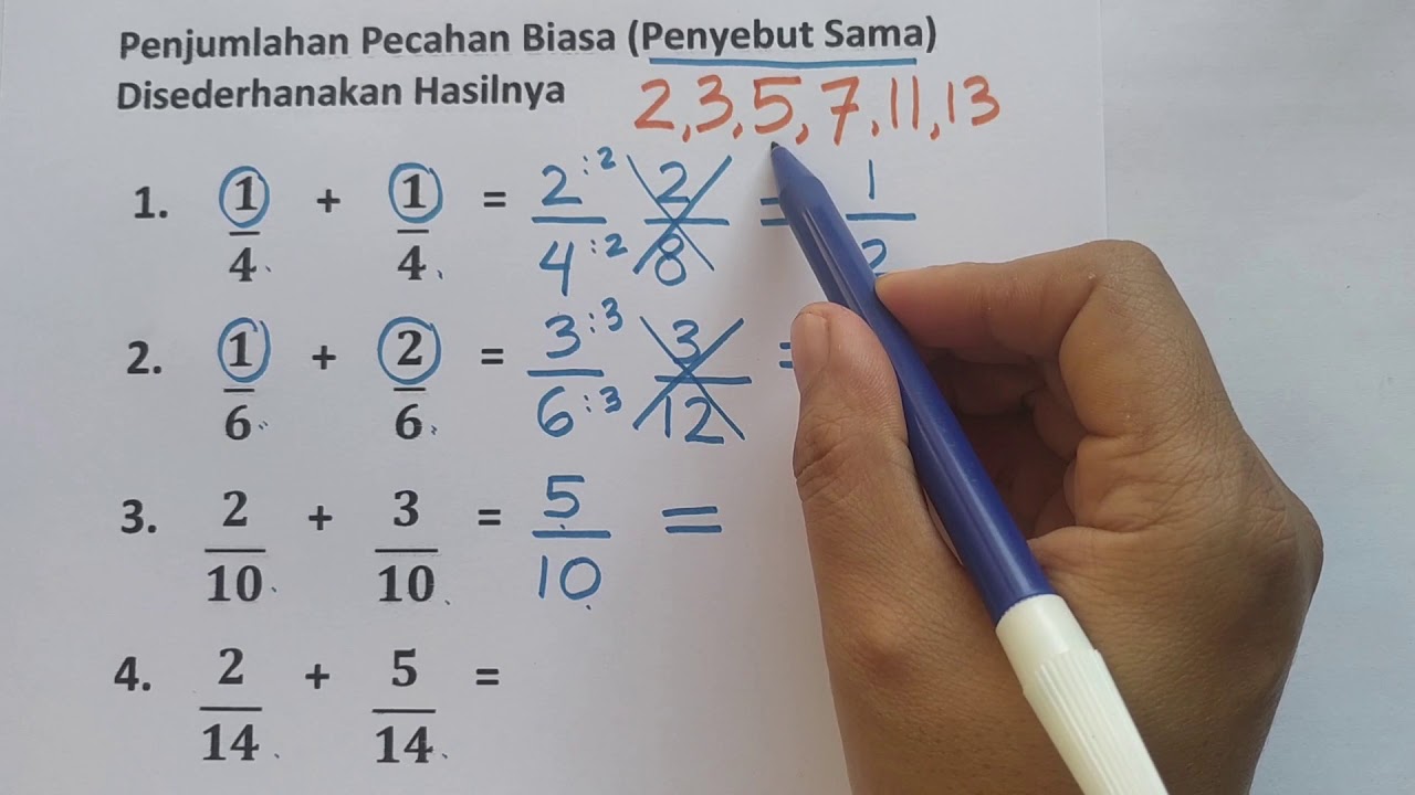 Penjumlahan pecahan biasa 3 bilangan. Hal ini berlaku kepada pembilang harus kurang atau lebih kecil dibandingkan dengan. 14 25 910. Pecahan biasa merupakan pecahan dengan pembilang dan juga penyebut dengan angka yang bulat atau bisa juga disebut bilangan bulat.
