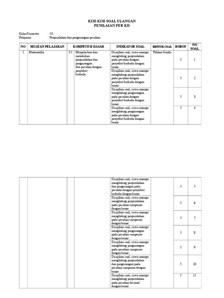 Soal Penilaian Tengah Semester 1 Matematika Kelas 5 K 13 Sekolahdasar Net